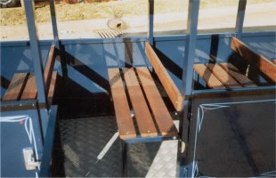 Carriages may also be constructed to suit your specific needs. Options for seating are many and include fiberglass seating as well as wooden slat seating as illustrated here.